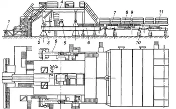 Основи бурових установок складаються з вишкового, лебідочного і енергетичного блоків, блоків для розміщення свічників і обладнання для приготування розчинів. Для прискорення монтажно-демонтажних робіт вишковий і лебідочний блоки об'єднуються у вишко-лебідочний блок, який являє собою металеву двоярусну споруду (рис.). Нижній ярус складається з основних поздовжніх 6 і поперечних 2 балок. До поперечних балок 2, що спираються на ґрунт, приварені кронштейни 5, які слугують опорами щоглової вишки, і опори 3 для підкосів, що утримують вишку у вертикальному положенні. На нижньому ярусі установлені бурова лебідка, привід ротора, механізм кріплення талевого каната та ін. До балок 2 приєднані несучі колони верхнього ярусу. На робочому майданчику 4 верхнього ярусу розміщені підсвічники, ротор, допоміжна лебідка, ключ АКБ і пульт бурильника. Рама робочого майданчику зварної конструкції складається з двох поздовжніх балок для установки підсвічника і двох підроторних балок.