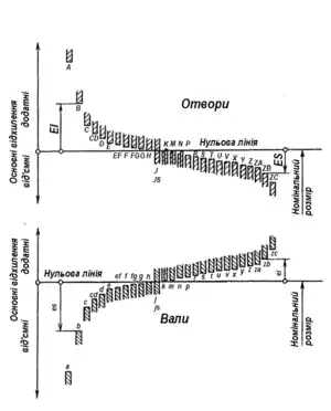У системі допусків і посадок для утворення полів допусків для кожного інтервалу номінальних розмірів встановлені ряди допусків з 20 квалітетів і по 28 основних відхилах полів допусків валів та отворів. Позначають основні відхили однієї або двома буквами латинського алфавіту — великими (A, B, C, CD, D ... ZC) для отворів і малими (a, b, c, cd, d ... zc) для валів.