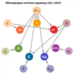 (h — стала Планка, c — швидкість світла у вакуумі, ΔνCs — частота, що відповідає переходу між двома надтонкими рівнями незбуреного основного стану атома цезію 133Cs) |