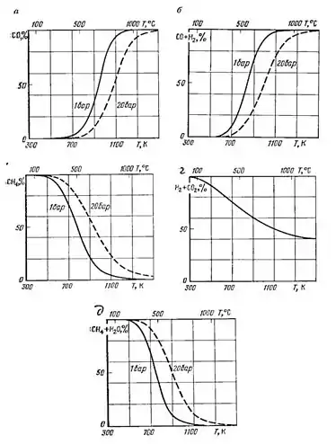 При гідрогазифікації вугілля утворення метану сприяють високий тиск водню і відносно низька реакційна температура. Проте утворення великого обсягу окису вуглецю при газифікації відбувається тільки при високій температурі і нормальному тиску, так як в цих умовах рівновага практично повністю зміщена в бік окису вуглецю.