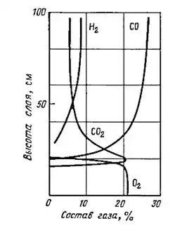 У тонкому шарі палива кисень повітря відразу ж перетворюється на окис вуглецю. Розкладання пари і утворення окису вуглецю відбуваються в набагато більшому обсязі і лише після того, як витратиться кисень і нагріються вугілля та газ.