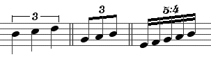 При позначенні особливого виду ритмічного поділу над нотним ребром вказують цифру, що позначає на яку кількість поділена тривалість (прикл.2 — тріольні вісімки). Якщо поділ стосується нот, що не можуть бути записані під ребром (наприклад четвертні тріолі, приклад 1) використовують дужку (англ. bracket). В складних випадках поділ може записуватися як відношення (англ. ratio) застосованого поділу тривалості до звичайного (прикл.3 — 5 нот замість 4).