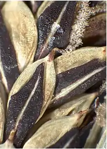 Плоди — сухі, обернено-яйцеподібні, коричневі горішки завдовжки близько 2 мм, завширшки 1,5 мм.