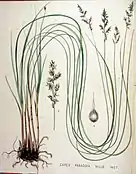 Багаторічна трав'яниста рослина 50–100 см заввишки. Листові пластинки 3–4 мм шириною. Нижні лускоподібні листки коричнево-чорні або майже чорні, розпадаються на численні прості волокна, що одягають основи пагонів; іноді на волокна розпадаються тільки кінчики лускоподібних листків. Суцвіття 5–6 см завдовжки. Покривні луски жіночих квіток з вузькою плівчастою облямівкою. Мішечки попереду з 10–13 жилками[2].
