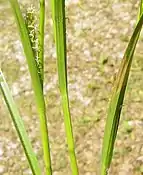Багаторічна трав'яниста рослина 30–100(120) см заввишки. Рослина з горизонтальним і геотропним (який росте вниз) кореневищем. Листки вузькі, 1-складчасті, довгі. Суцвіття 8–12(15) см завдовжки, з декількох довгастих розставлених колосків. Покривні листки колосків без піхв, у кілька разів перевищують колоски[2]. 2n = 56[3].