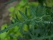 Дворічна або однократно квітуча багаторічна трава заввишки 50–150(300) см. Коріння мочкувате. Стебла від нерозгалужених до розгалужених на верхівці, крилаті, колючі, рифлені, шерстисті, зазвичай темно-червонуваті. Листки перисто-роздільні, з 2–3-лопатевими частками, павутинисто-повстяні, на краях із короткими шипуватими віями; лопаті й зубці листя і крила стебел закінчуються тонкими буро-світло-жовтими колючками 1–5 мм довжиною. Обгортка1 яйцеподібна, досить густо-паутиниста, буро-пурпурова. Від малої до значної кількості квіткових голів розміром 1–1.5 см зібрані в густих скупченнях. Квітки пурпурні (іноді білі або рожеві), відгин віночка менше ніж до середини 5-роздільний. Папуси 9–11 мм. Сім'янкоподібні плоди від рудувато-коричневого до солом'яного забарвлення, 2.5–3.5 мм з комірами 0.1–0.2 мм, блискучі. Квіти відвідує широкий спектр комах.