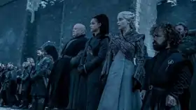 ![]() Варіс, Міссандея, Данерис і Тиріон оплакують тих, хто загинув у битві за Вінтерфелл Варіс, Міссандея, Данерис і Тиріон оплакують тих, хто загинув у битві за Вінтерфелл | |||||