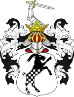 Щит увінчаний дворянськими шоломом і короною. Нашоломник: озброєна мечем рука. Намет на щиті чорний, підкладений сріблом.