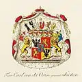 - Графський герб (Пруссія): щит із фрайгерським гербом Остенів-Закенів, увінчаний графською короною. Його тримають обачіч золоті леви, із оберненими головами і червоними язикам. Над графською короною три шоломи, які мають різні клейноди: центральний з клейнодом Остенів-Закенів; правий — з коронованим орлом, розтятим на чернь і срібло; лівий — яструб із золотим озброєнням, що тримає правою лапою срібну підкову з хрестом (клейнод Яструбця). Намет центрального шолома — червоний, підбитий сріблом; бокових шоломів — сині, підбиті золотом.