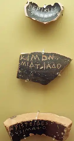 Закон про остракізм, згідно з античними джерелами, було введено задля запобігання тиранії і боротьби з потенційними узурпаторами влади[16]; це популярне уявлення про остракізм уперше чітко висловлюється в IV столітті до н. е. Літературні джерела і остракони згадують, що окрім боротьби з тиранією, було безліч підстав для остракізму — від надмірного впливу і авторитету (випадок Фемістокла), корупції і поганого виконання обов'язків до перелюбу й інцесту[17].