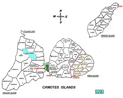 Розташування островів, муніципалітетів та баранґаїв на островах Камотес.