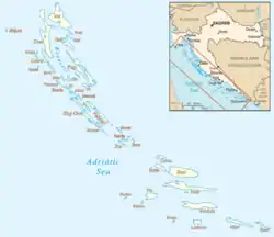 Острови Хорватії. Особливістю далматинського узбережжя Адріатичного моря є велика кількість островів, відомих також як Далматинські острови. Їх розміри коливаються від великих островів площею 405 км² до малих скель. Всього Хорватії належить 1185 островів. З них тільки 47 (з 2000 року — 46) населені, 671 (з 2000 року — 672) мають статус безлюдних островів, 389 є скелями, 78 — рифами[1].