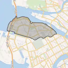 На півдні відокремлений від Василівського острова річкою Смоленкою, на заході омивається водами Фінської затоки, на півночі — Малою Невою.