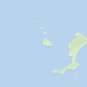На північний захід від острова лежать 2 скелястих дрібних острівця загальною площею 0,058 км² та висотою відповідно 47,4 м та 51,2 м. Між острівцями та островом тягнеться риф, на якому на рівних відстанях один від одного знаходяться 3 надводних каменя. На північний захід від острівців знаходяться 2 великих та декілька дрібних гостроконечних кекурів. Вони з'єднані з острівцями низькою кам'янистою грядою[1].