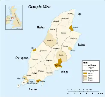 - Райони-міста (town districts): Дуглас (столиця), Рамзі, Каслтавн, Піл