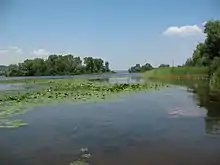 По краю острова розвинена болотяна та прибережно-водна рослинність за участі череди листяної (Bidens frondosa), вовконога європейського (Lycopus europaeus), ситника сплюснутого (Juncus compressus), рогозу широколистого (Typha latifolia), та водна рослинність представлена угрупованням елодеї канадської (Elodea canadensis), водяного горіха плаваючого, який включено до Червоної книги України (2009а), глечиків жовтих та їжачої голівки прямої, що охороняються на території Києва рішенням Київради 23.12.2004 р. за № 880/2290 (Перелік рослин та тварин…), а також ряски малої (Lemna minor) та завитки ряснокореневої (Spirodela polyrrhiza). На вологих пісках в прибійній зоні поширені куртини красивомошки загостреної (Calliergonella cuspidata).