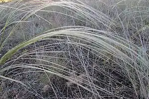 Довгий густо волосистий остюк на насінині ковили забезпечує рослині поширення вітром на великі відстані. (Національний природний парк «Олешківські піски»)