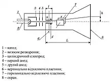 У осцилографах застосовують трубки з електростатичним відхиленням, на відміну від телевізорів та моніторів, де використовується магнітне відхилення. Такі трубки складніші у виробництві але мають більш широкий діапазон частот.