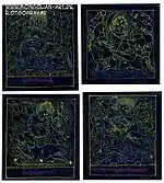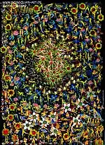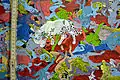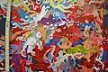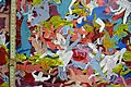 - Час від часу його мистецтво нахиляється до майже гротеску, ніби картина була настільки насичена людьми, що вони починають пожирати один одного. Цілі армії зникають у пащі іншої людини; маси людей тісно звиваються навколо один одного, і це може бути або пов'язано з перенаселенням, або з глобальною оргією, що гине.[15]
