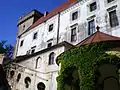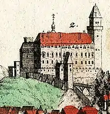 Замок, побудований на гранітному пагорбі (225 м н.р.м.), височіє над околицею[1]. Первісний середньовічний замок розташовувався там, де зараз знаходиться східна частина північного крила будівлі. Він був триповерховою будівлею на прямокутному плані розмірами 11,5 × 22 м. З того періоду збереглася висока чотиригранна вежа, увінчана машикулями[1]. Замок було з'єднано оборонними мурами та оточено ровом[1]. Північна стіна вежі була оздоблена гербом єпископа Єріна в оточенні Івана Хрестителя та Івана Євангеліста[1]. Всередині збереглися кімнати для ув'язнених.