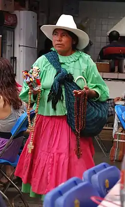 Чоловіки носять білі широкі штани, червоні широкі пояси, короткі білі сорочки навипуск з вишивкою по коміру, сандалі, серапе з геометричним орнаментом і бахромою по краю, на грудях — ткані сумочки з візерунком, біля пояса — шкіряні. Жіночий одяг складається з вовняної запашної спідниці з тканин до 5 м завдовжки або зшиті в складку і підперезані візерунковим поясом, білі візерункові уіпілі, накидки-серапе в біло-чорну смужку до щиколоток, срібні сережки, намиста, в косах — кольорові вовняні нитки; іноді верхня частина тулуба оголена.