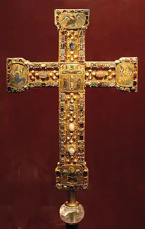 Значна частина церковних предметів — хрести, релікварії, фасади вівтарів та обкладинки книжок або робились з золота, або покривались його шаром, прикрашались коштовним камінням, емаллю, кристалами та камеями[27]. Це було традиційно, але в оттонському мистецтві отримало свої особливості — дуже насичене прикрашення поверхні, часто дорогоцінні каміння піднімались над основною поверхнею на маленьких золотих баштах, оточувались проекціями «вуликів» з золотого дроту, а карбовані по золоту рельєфи заповнювали ділянки між пластинами емалі та прикрасами з дорогоцінного каміння. Реліквій набували все більшої важливості, деколи політичної, а тому створювались все більш багаті релікварії для їх зберігання[28]. У таких витворах дорогоцінні камені не лише створювали враження багатства, а й давали уявлення про дорогоцінну природу Небесного Єрусалиму, крім того існувала віра, що певні види каменів мають могутні властивості у різних «наукових», медичних та магічних аспектах, як було зазначено у популярних лапідарних книгах[29]. Декілька вцілілих зразків світських прикрас мають схожий стиль, у тому числі дитяча корона Оттона III, які він подарував скульптурі Ессенської Золотої Мадонни, коли виріс з неї[30]