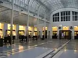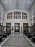 Зона для клієнтів складається з великого вхідного приміщення, вестибюля та тринефного банківського залу. Підлогу у залі виконано із скляних блоків, що дало змогу забезпечити приміщення, як розташоване поверхом нижче, денним освітленням. Стеля — арочне перекриття зі скла, з алюмінієвими опорам. Стіни знизу облицьовані мармуровими панелями світло зеленого кольору, а з верху білим, скляними.