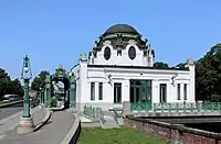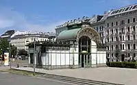 Станція Карлсплатц (спочатку Академієштрассе). Будівля має бочкоподібною кришу, з рельєфного листового заліза. На фасаді архітектор облицював видиму металеву конструкцію білими мармуровим панелями.