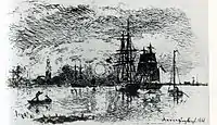 Йоган Бартольд Йонкінд. «Захід сонця в порту Антверпена», офорт 1868 р.