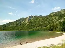 Круті західні та східні береги вкриті змішаним схиловим лісом, який у верхніх частинах близький до природного. Домінуючими породами дерев тут є ялина європейська, яку також насаджують, бук звичайний та явір.[6] На півночі є невелике мулисте торфове болото, в якому домінує осока висока. Перед мулистим болотом розташовуються плавні з розрідженим населенням очерету , куги озерної та осоки носатої.[7] У східній частині зони замулення також є чорновільхові болотні ліси. Внутрішні — вологі луки з високотрав'янистими угрупованнями, на яких домінує гадючник болотяний. Дорога на західному березі з береговими укріпленнями перешкоджає майже природному розвитку берега.[8]