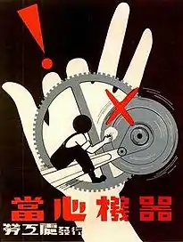 Крім цього на верстатах встановлюють захисні кожухи на вузлах, які передбачають крутні моменти. Всі захисні кожухи з внутрішнього боку, фарбуються в жовтий колір (сигнальний), а ззовні, наноситься знак безпеки за ГОСТ 12.4.025-86 (рівнобічний трикутник жовтого кольору з вершиною доверху, в чорній рамці і знаком оклику посередині). Під знаком встановлено таблицю з написом «При ввімкненому верстаті не відкривати».