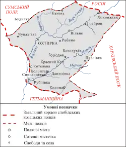 У 1732 році полк поділявся на 20 сотень, адміністративними центрами яких були міста Охтирка, Богодухів, Боромля, Грайворон, Коломак, Колонтаїв, Котельва, Краснокутськ, Мурафа, Рублівка, Хухра та ін. На той час на території полку існувало 13 міст, 63 села і слободи, 11 хуторів.
