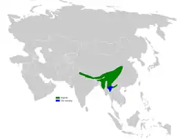 Вид поширений центральному та південному Китаї, на півночі М'янми та В'єтнаму, у Непалі, Бутані, на півночі Індії, в Лаосі і Таїланді, а також може траплятися на північному сході та південному сході Бангладеш. Його природними середовищами існування є субтропічні або тропічні гірські тропічні ліси, луки та чагарники.