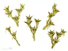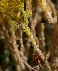 Листки дрібні (2,5 мм завдовжки, 2—3,5 мм завширшки), м'ясисті, яйцеподібні, зверху опуклі, розташовані черепичасто в п'ять-шість рядів на безквіткових гілочках.