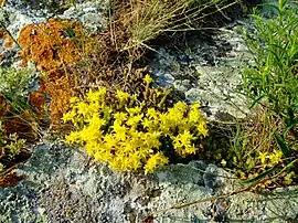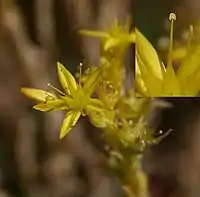 На квітконосних пагонах листки розташовані рідше. Квітки майже сидячі, звичайно зібрані в розгалужені суцвіття, які складаються з трьох — п'яти колосоподібних гілочок, часом квітки поодинокі, на кінцях гілочок. Квітки середніх розмірів, оцвітина подвійна. Чашечка світло-зелена або жовтувата з п'ятьма довгасто-яйцеподібними чашолистками (2—3 мм завдовжки). Віночок золотисто-жовтий з п'яти вільних пелюсток, у 2—3 рази більших за чашечку. Тичинок 10. Вони трохи коротші від пелюсток. Маточок п'ять, зав'язь верхня, одногнізда.