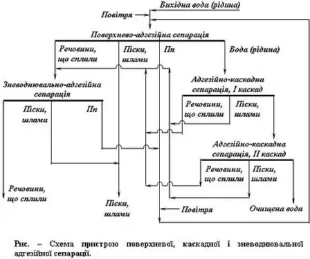 Повітряні бульбашки, тверді речовини і речовини, що до них прилипли виносяться на межу «повітря – вода» потоками рідини (пульпи). Переваги пристроїв адгезійного очищення стічних вод такі: пристрої самонастроюються; займають невелику площу; разом з нафтою і маслами виводяться й тонкі шлами; вміст кисню збільшується до вмісту звичайної води; застосування коагулянтів не потрібне.