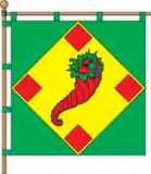 На квадратному зеленому полотнищі вписаний жовтий ромб, на якому червоний ріг достатку, супроводжуваний в кутках червоними ромбами.