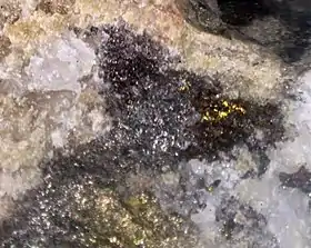 Знайдений у родовищі Серро-Бонето (Болівія) з халькопіритом і бісмутином.