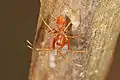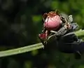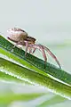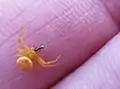 Самець Thomisus їсть маленьку комашку, можливо, Heteroptera. Пальці на задньому фоні дають уявлення про масштаб.