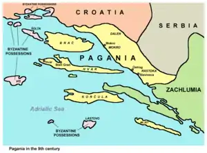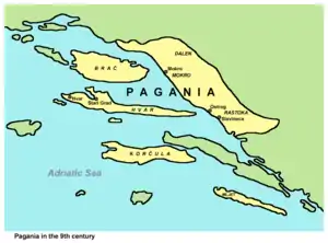Паганія мала кордон з Хорватією на заході і терени йшли на схід від річки Цетина. Князівство було поділено на три менші князівства (Макарська, Расточка/ Расток, Даленська). Воно також включало острови Млєт, Корчула, Брач і Хвар. Головні міста в Паганії були: фортеці Оміш, Вруля, Макарська, Острог, Лавцен.