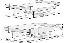 Скляні панелі складають задні стінки та бокові стінки (найближчі 2 бокові панелі до задніх стінок), тоді як металеві сітчасті панелі займають боки. [8]