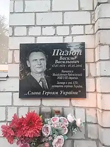Меморіальна дошка Василю Пазюну на стіні загальноосвітньої школи с. Михайлівка-Рубежівка - Присвоєно звання «Герой-захисник Вітчизни» Києво-Святошинського району (згідно рішення Києво-Святошинської районної ради, 20.12.2016).