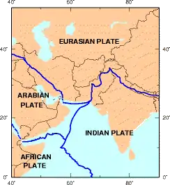 Пакистан у своїй геологічній будові перекриває як індійську та євразійські тектонічні плити. Де його провінції Сінд і Пенджаб лежать на північно-західній частині Індійської платформи, а Белуджистан і більша частина Північно-Західної прикордонної провінції знаходяться в межах Євразійської плити. Північні райони і провінція Азад Кашмір лежать в основному в Центральній Азії по краю Індійської плити і тому схильні до проявів руйнівних землетрусів, спричинених стиканням двох тектонічних плит.