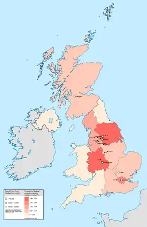 | Регіон | Відсоток від загальної кількості британських пакистанців | Британські пакистанці у відсотках від населення регіону |