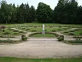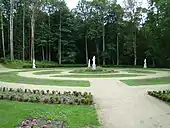 Природною основою парку є релікти давніх соснових лісів. Ялини і чорні вільхи ростуть в більш вологих місцях. Доріжки і квадрати з квітковими композиціями ефектно розташовані серед дерев. Контраст підкреслюється правильною формою палацу: північна сторона відкривається на чудову терасу і сходи, що ведуть в парк. Квіти та фонтан ще більше посилюють ефект. Південна сторона палацу оточена овальним садом троянд, який з'єднується з терасами палацу сходами.