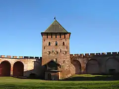 Палацова вежа розташована в південній частині Кремля на березі річки Волхов. Відрізняється від інших веж струнким силуетом.