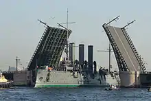 Крейсер «Аврора» проходить під розведеним Палацовим мостом