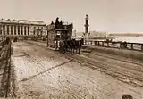 У 1877 році мостом прокладено лінію конки.[9] У 1878 році на мості вперше у Петербурзі у вигляді експерименту було випробовано електричне освітлення. Для цього на Васильєвському острові було встановлено паровий котел та електромагнітну машину, від якої струм по дротах подавався на 8 ліхтарів зі свічками П. М. Яблочкова. Протягом 10 днів міст освітлювався всю ніч. З початком льодоходу ліхтарі було перенесено на Олександринську площу (нині площа Островського).[10][11]