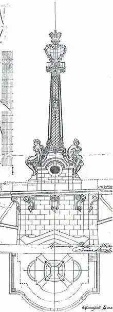 До спорудження був прийнятий варіант Товариства Коломенських заводів. Архітектурне оформлення за розпорядженням президента Академії мистецтв було доручено архітектору Р. Ф. Мельцеру. Він розробив дуже пишне і помпезне оформлення: поручні складного малюнку з «чеканними двосторонніми прикрасами з товстого листового заліза», декоративні карнизи з «картушами, виконаними із товстого заліза», вісім ліхтарів з викованим із заліза декором тощо.[22] На широких опорах розвідного прольоту мали бути встановлені чотири великі ліхтарі-маяки висотою 14 сажнів, що включали в себе підйомні машини для людей та балкони навколо ліхтарів. Основа ліхтарів прикрашалася складною скульптурою, орнаментами, картушами, імператорськими орлами.[23]