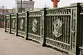 Чавунна огорожа замість дерев'яних поручень з'явилася лише у 1939 році. Ці решітки вилиті скульптором І. В. Крестовським за малюнком архітектора Л. О. Носкова.[30] Передбачені проєктом великі прикрашені орлами ліхтарні стовпи на опорах мосту так і не були встановлені.